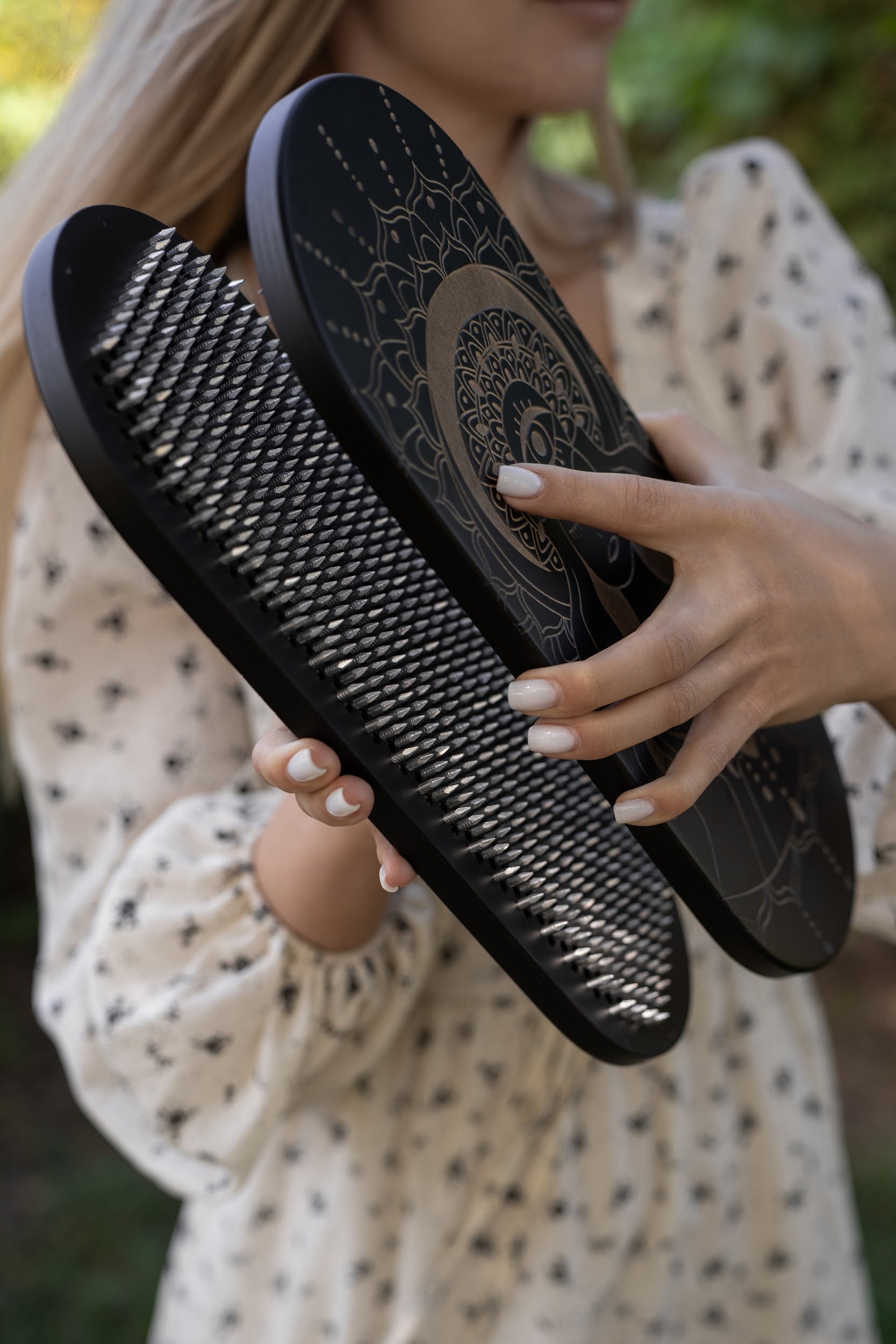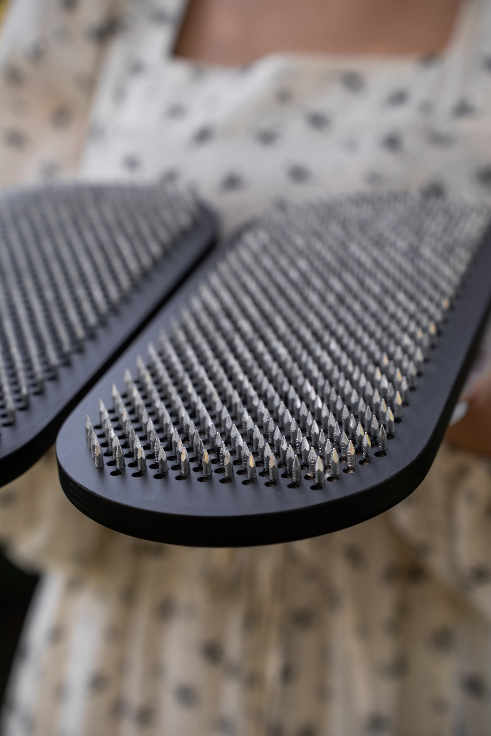 We use premium galvanized or 100% copper nails, arrange nails in the flower of life (hexagon) configuration - a symbol of spiritual development, metamorphosis, and awakening consciousness. Sadhu Board is a unique and effective tool for awakening Inner Energy. Standing on nails helps relieve physical pain, tension, and stress, promoting relaxation and well-being.